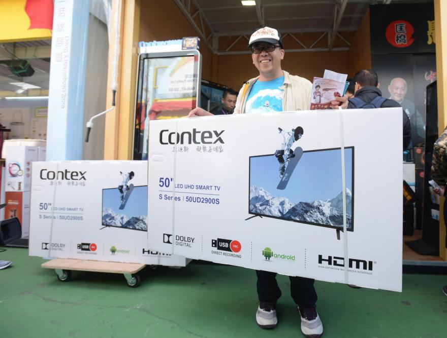 黃先生排隊10多小時,用400元買到50吋4K高清電視。 記者 崔俊良攝