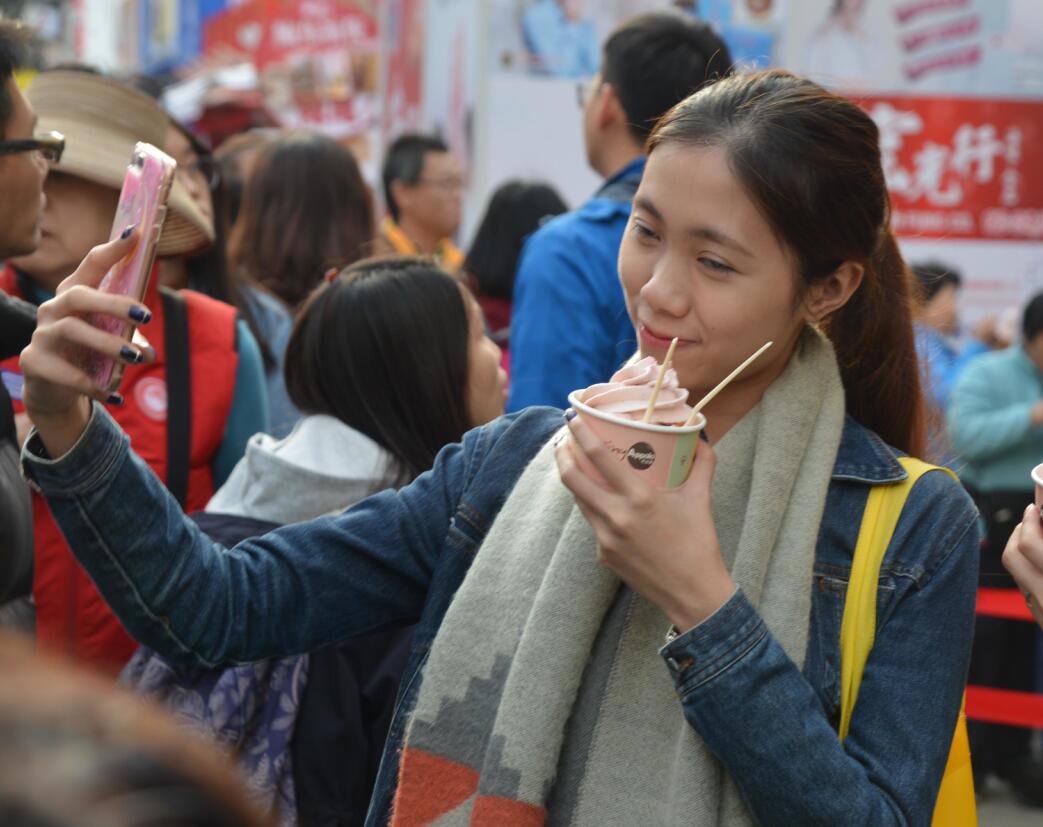 工展会场内,这位小姐还边食雪糕边自拍,好像不知寒流为何物。