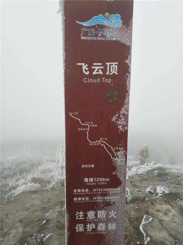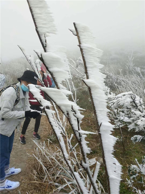 当天下午,罗浮山户外协会会长刘福伟与20多名会员结伴上山观看冰挂。据其介绍,飞云顶温度大概有-3℃,站在顶上往下遥望满山都是白雪皑皑的景象,冻得随身带的手机都用不了。
