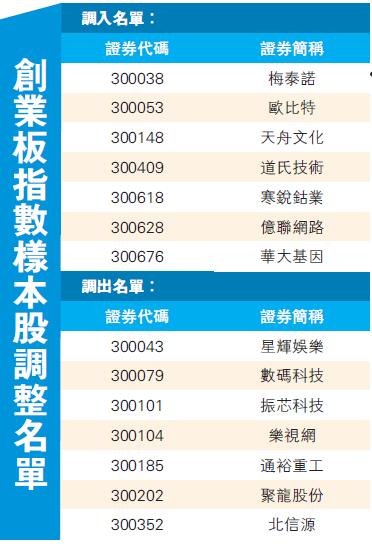 公告披露對深證成指、深證100、中小板指、創業板指、中小創新等指數實施樣本股定期調整。其中創業板指的變動較小,樂視網恰在其列,僅有7隻個股「換血」,而華大基因(300676)等獲得納入。