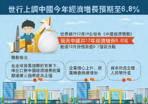 【香港商報网訊】世界銀行昨日發布報告,將中國2017年的經濟增長預期上調至6.8%。這比世界銀行在10月預測的6.7%提高了0.1個百分點。基於中國個人消費和外貿對於經濟增長的支持,世界銀行做出了這一上調。