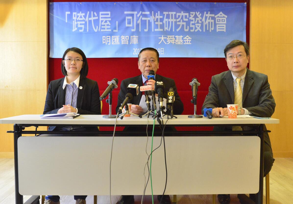 大舜基金主席兼明匯智庫榮譽顧問何鍾泰(中)、明匯智庫研究主任謝曉虹(左)、理工大學建築及房屋地產學系教授許智文(右)出席记者会,讲述政策可行性。记者冯俊文摄