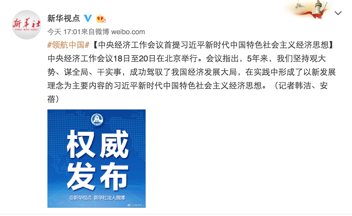中央经济工作会议18日至20日在北京举行。会议指出,5年来,我们坚持观大势、谋全局、干实事,成功驾驭了我国经济发展大局,在实践中形成了以新发展理念为主要内容的习近平新时代中国特色社会主义经济思想。