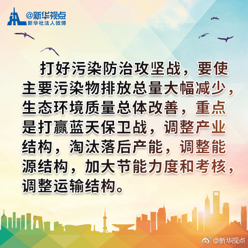 会议指出,打好污染防治攻坚战,要使主要污染物排放总量大幅减少,生态环境质量总体改善,重点是打赢蓝天保卫战,调整产业结构,淘汰落后产能,调整能源结构,加大节能力度和考核,调整运输结构。