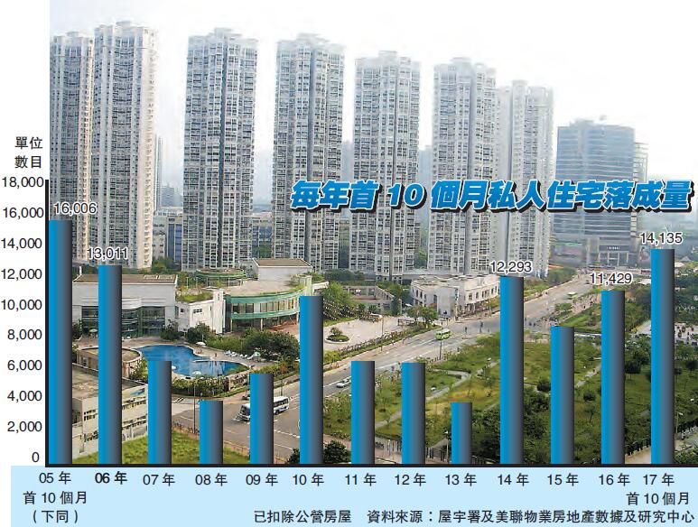 另外,根據屋宇署昨日發表最新數據,10月份全港共有6個私人住宅項目動工,總共涉及2720伙,較9月份的915伙增加1.97倍;今年首10個月累積動工量達18725伙,較去年同期的16773伙增近12%,創2001年以來的17年同期新高。利嘉閣地產研究部主管陳海潮表示,在大埔及屯門兩個大型項目開展施工支持下,私人住宅動工量不但按月大增,動工量亦已連續三年超越1.8萬伙,反映近年私宅供應持續穩增。