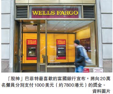 在銀行業方面,「股神」巴菲特最喜歡的富國銀行宣布,將向20萬名僱員分別支付1000美元(約7800港元)的獎金,並將最低工資提升至每小時15美元,較之前的13.5美元提升11%;明年還將向社區和非營利組織捐款4億美元,並於2019年開始將其稅後淨利潤的2%用於慈善事業。高盛預計,富國銀行將成為此次減稅的最大受益者,在2018年的每股淨收益(EPS)將增加18%。