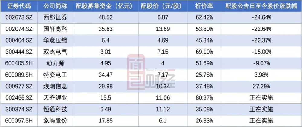 上表为面包财经整理的今年已经完成及正在实施配股的上市公司名单。