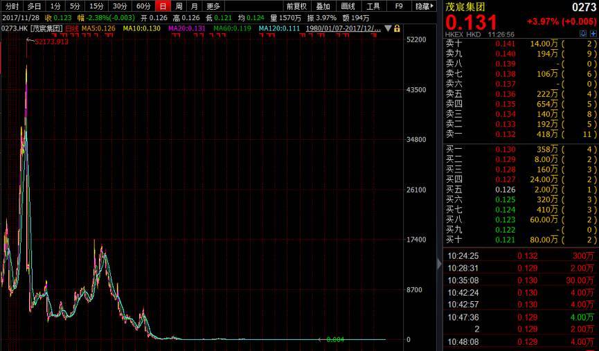 我们以威利国际为例,现在已经更名为茂宸集团(0273.HK)。先看K线图的复权走势。