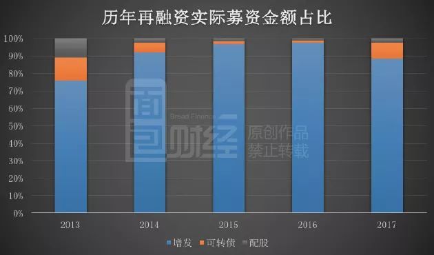 我们来看一下今年A股再融资的具体变化情况。下图为面包财经根据wind数据测绘的三种主要再融资方式募资金额占比情况: