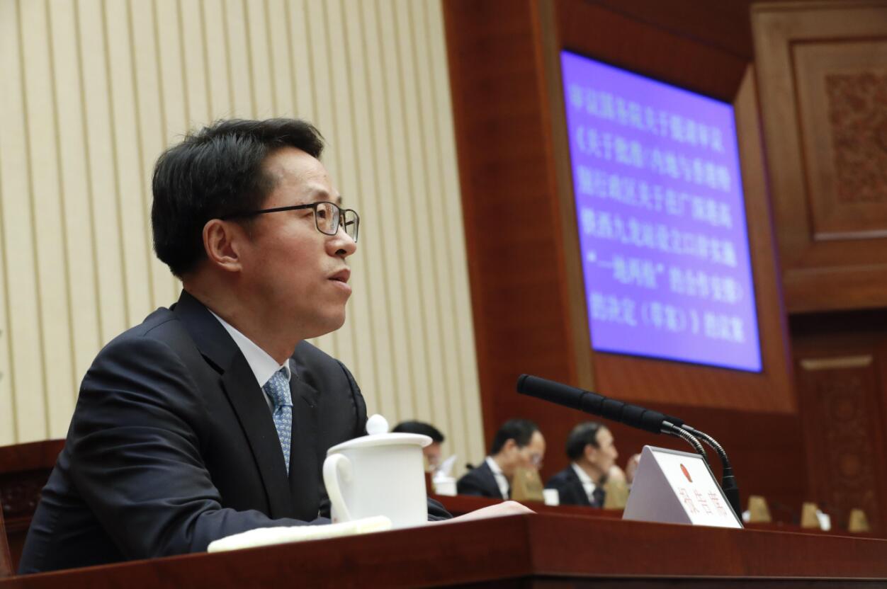 国务院港澳办主任张晓明就「一地兩檢」议案作说明介绍。中新社