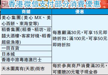 佳節臨近,微信支付(WeChatPayHK)在香港亦推出一系列推廣活動及禮遇,由即日起至2018年1月31日,微信支付用戶於美心集團、稻香集團、一田百貨、日本城及香港中旅粵港澳巴士指定合作商戶消費,簡單進入「錢包」功能并按「付款」,每惠顧滿30元(港幣,下同),可享15元即時折扣;每滿100元即時折扣更高達50元。