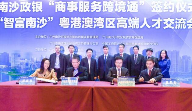 【香港商报网讯】记者李苑立报道:22 日,南沙政银"商事服务跨境通"签约仪式暨"智富南沙"粤港澳湾区高端人才交流会在南沙举行。该区市场和质量监督管理局、投资贸易促进局、政务办及中国工商银行等机构共150余名代表参会,共同见证了南沙商事服务"跨境通"合作的签署。