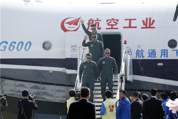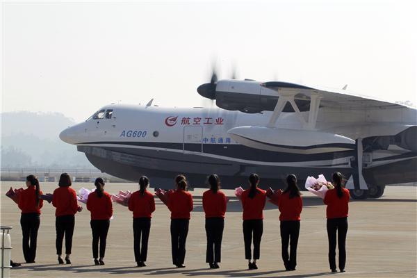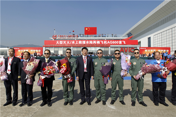 9时43分许,由机长赵生、副驾驶陈明、机械师魏鹏和监控观察员孙康宁组成的首飞机组,驾驶AG600飞机001架腾空而起,在珠海机场西南3000米高度规定的空域内巡航平稳飞行,完成了飞机各系统和基本操纵特性初步检查、模拟着陆等预定试飞科目后,安全返航着陆,通过气势恢弘的水门回到主席台前。机长赵生着陆后报告首飞取得圆满成功。
