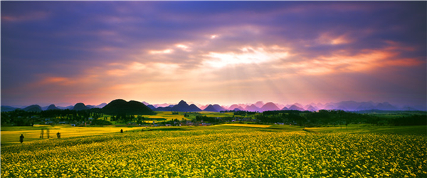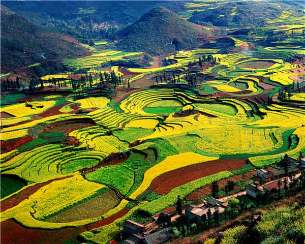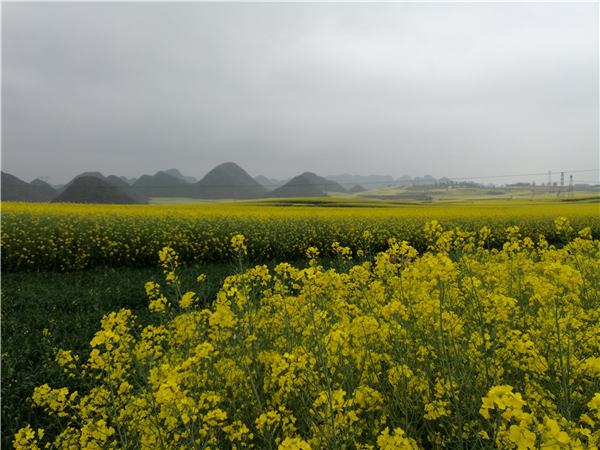 罗平是我国的油菜生产基地县,也是蜜蜂春繁和蜂产品加工基地。每年的春节过后,罗平便是油菜花的海洋。这恐怕是世界上最奇特花的“海”了。油菜花竞相开放、金浪翻滚、片片块块、高低起伏、蝶舞蜂飞、清香沁人。花曲折迂回、螺旋泻落、与远山近水、村落人家互相辉映。它是金色的,金得耀眼,花吹奏着牧歌的,让你找到“心归之处”。