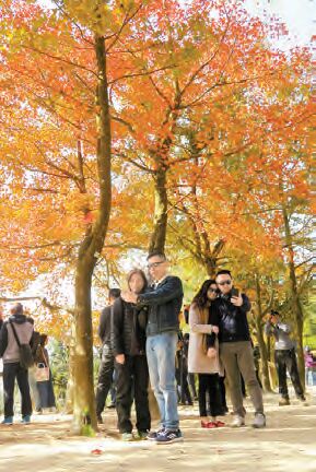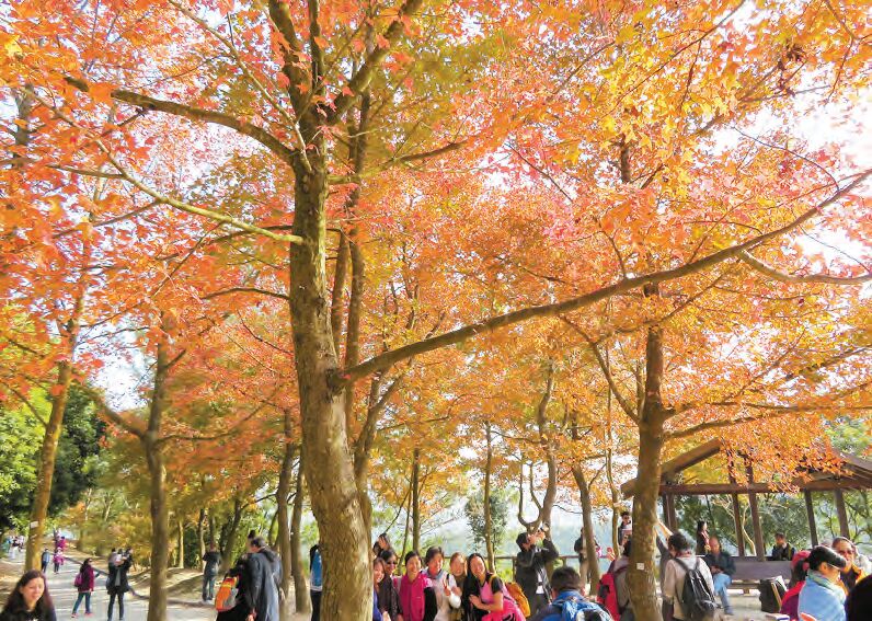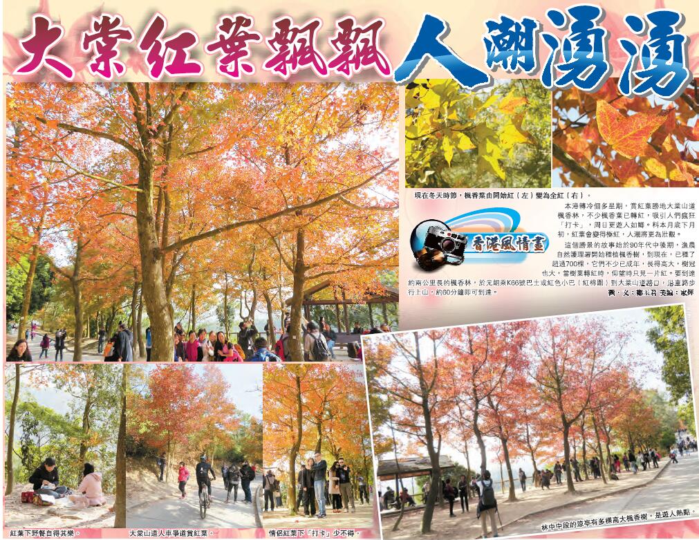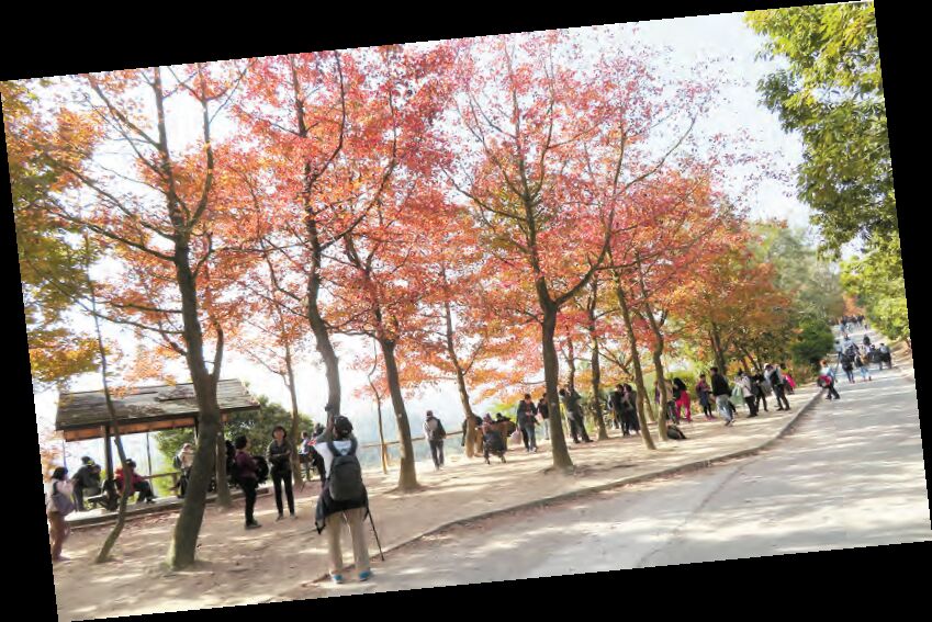這個勝景的故事始於90年代中後期,漁農自然護理署開始種植楓香樹,到現在,已種了超過700棵,它們不少已成年,長得高大,樹冠也大,當樹葉轉紅時,仰望時只見一片紅。要到達約兩公里長的楓香林,於元朗乘K66號巴士或紅色小巴(紅棉圍)到大棠山道路口,沿車路步行上山,約60分鐘即可到達。圖、文:鄭玉君 美編:家輝