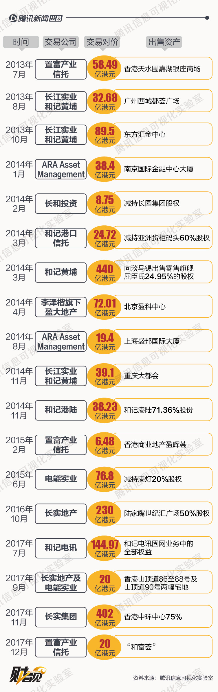 实际上,据不完全统计,自从2013年始,李嘉诚已经持续抛售在港资产套现逾1000亿港元,其中包括港口、连锁店以及电力企业等板块。