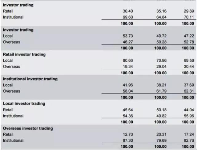 对于个人投资者这个较弱势的群体,我们看到本地投资者虽然占了三分之二以上,但比例在下降,而海外个人投资者的比例在上升。本地投资者中的个人投资者比机构投资者占比略低。