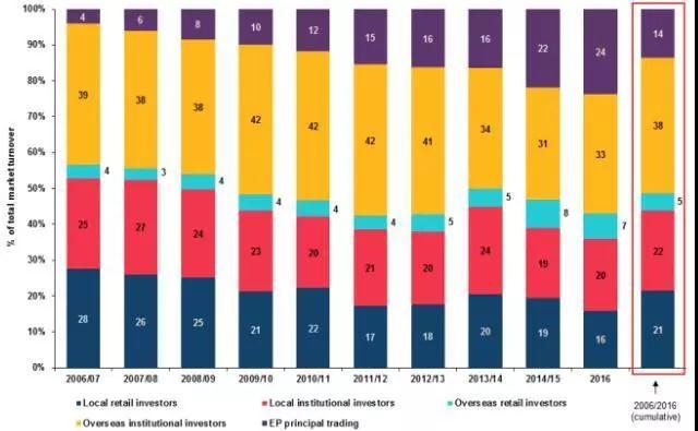 上图显示了2006-2016年间,港股市场不同类别的投资群体占交易的比重。我们看到本地个人投资者和海外个人投资者的增长是比较明显的。这反映了港股的散户化程度是在加强。但是从整体上看,机构投资者仍占大半的市场交易份额。