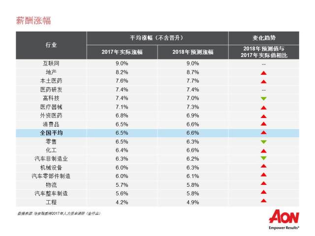 近日,怡安集团旗下人才、退休和健康管理咨询公司怡安翰威特公布了2017年中国人力资本调研结果。2017年中国企业平均员工薪酬增长为6.5%。本次调研覆盖了北上广深及主要二三线城市共计3000余家企业,涉及高科技、互联网、地产、金融、医疗保健、汽车、机械设备和工业制造、消费品、零售、化工、物流、工程、酒店等十余个重点行业。