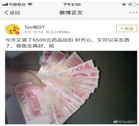 近日,网友@TAO韬GT发布于9月6日的一则微博被网友翻出。在发布于9月6日18时52分的这则微博中,@TAO韬GT晒出一张手抓呈扇形展开数十张百元大钞的照片,并配文称“今天又领了5500元药品回扣,好开心,又可以买东西了,做医生真好,哈”。