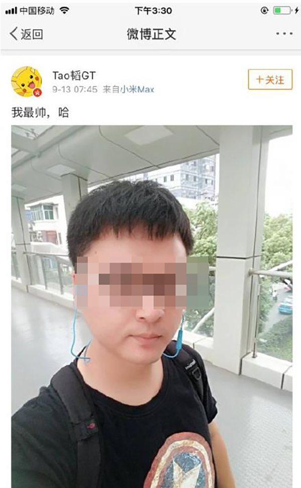@TAO韬GT微博简介显示,其任职于南昌市第二医院,从其微博发布的一张题为“我最帅”的自拍照来看,头戴耳机,鼻架黑框眼镜,身着黑色T恤,背黑色双肩包,打扮颇为时髦,年龄应在30岁以下。