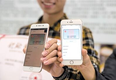 首批成功开通网络身份证的两位市民在手机上展示网络身份证。