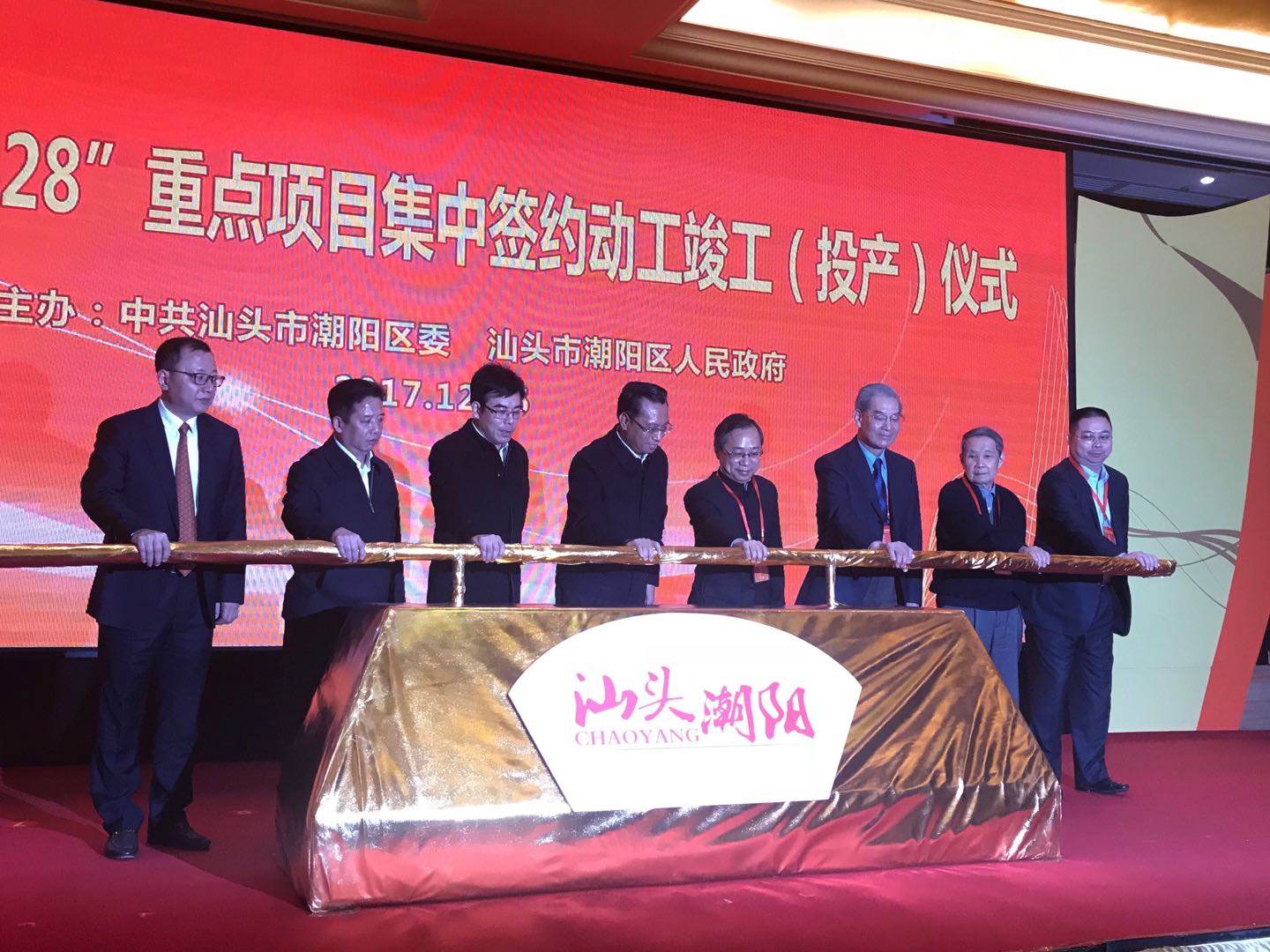 潮阳区委书记蔡永明在致辞时说,一年多来,潮阳区紧紧围绕“加快振兴发展,建设汕头西翼现代化新城区”的奋斗目标,按照“扭住一个总抓手、加强两个对接、营造三个环境、提升四个水平”的工作思路,致力于抓发展、惠民生;打基础、造环境;强管理、创文明;转作风、优服务,取得了明显的成效。一年多来,我区致力于抓发展、惠民生,经济形势持续向好,谋划建设榕江南岸新经济走廊,加快建设海门临港经济区,巩固提升贵屿循环经济产业园区,整理开发金浦、铜盂、谷饶、金灶产业园区,众多央企、国企、上市公司看好潮阳,投资落户或洽谈合作。中节能、TCL、桑德、广业、绿色动力、绿地、深深房、龙光、宝能、碧桂园、联泰等集团的项目已经落户,中国供销集团、梓盛发集团、三科集团等重大项目意向落地。今年全区预计完成地区生产总值385亿元,增长9%;工业总产值1097.2亿元,增长10.5%;规模以上工业总产值931.9亿元,增长12.2%;固定资产投资450.9亿元,增长22%。蔡永明说,一年多来,我区致力于打基础、造环境,破解了一批重点项目建设难题,环保交通设施日臻完善,目前,在潮阳境内,潮惠、揭惠、汕湛、潮汕环线、广汕高铁、牛田洋快速通道、厦深铁路潮阳站配套项目、以及国道省道拓宽改造和美化提升、市政道路、乡村主干道等一大批交通基础设施项目正在加紧建设,部分项目已投入使用。随着这些项目的全部建成通车,潮阳将形成以高铁、高速、港口为支撑,覆盖全区、无缝对接全市、全省经济圈和生活圈的一体化便捷交通体系。同时,致力于强管理、创文明,长期的污染问题得到有效治理,人居生态环境不断改善。坚持“三位一体”统筹推进创文强管、练江整治、农村人居生态环境整治。拆除违章建筑7.91万处,新建、改建市场31个、公园42个、广场47个,拓通改造道路280.5公里,完成128个村、社区的人居生态环境综合整治,19个美丽乡村示范村涉及的167个建设项目已建成77个。