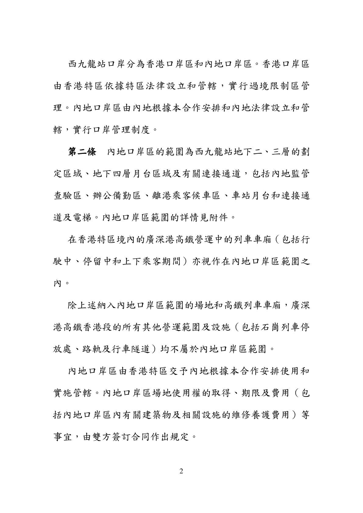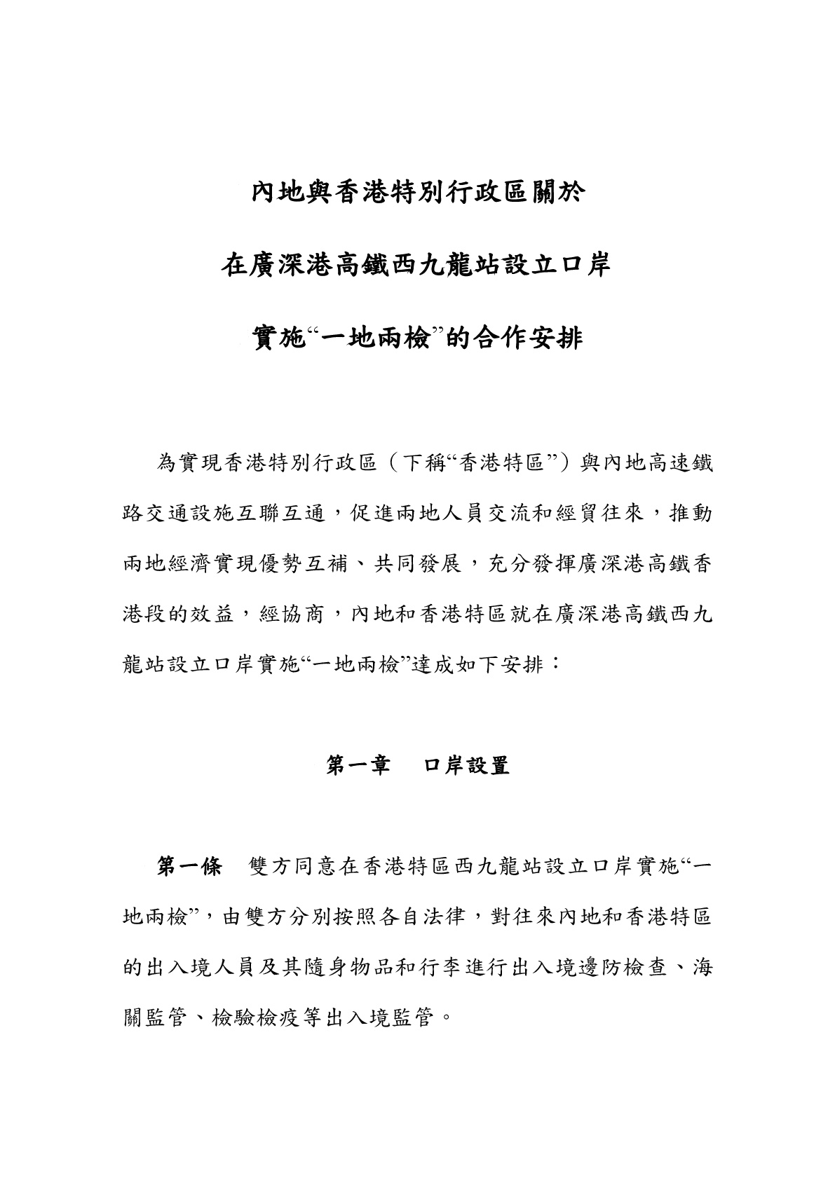 為實現香港特別行政區(下稱“香港特區”)與內地高速鐵路交通設施互聯互通,促進兩地人員交流和經貿往來,推動兩地經濟實現優勢互補、共同發展,充分發揮廣深港高鐵香港段的效益,經協商,內地和香港特區就在廣深港高鐵西九龍站設立口岸實施“一地兩檢”達成如下安排: