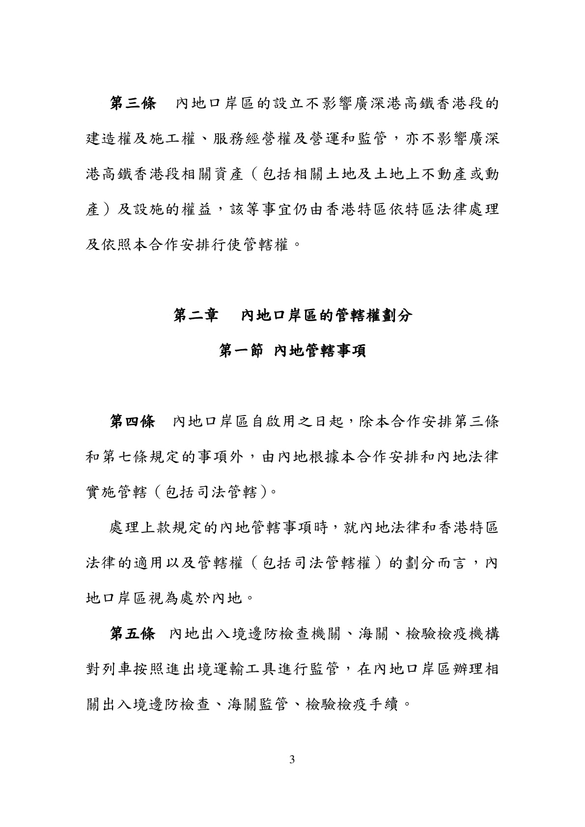 3、 有關廣深港高鐵香港營運商及服務供應商的經營、相關保險、稅務及其員工稅務及僱傭責任和權益、保障和保險的事項,前述服務供應商不包括向內地派駐機構或廣深港高鐵內地營運商提供服務而又不在內地口岸區以外的香港特區區域範圍經營之服務供應商;
