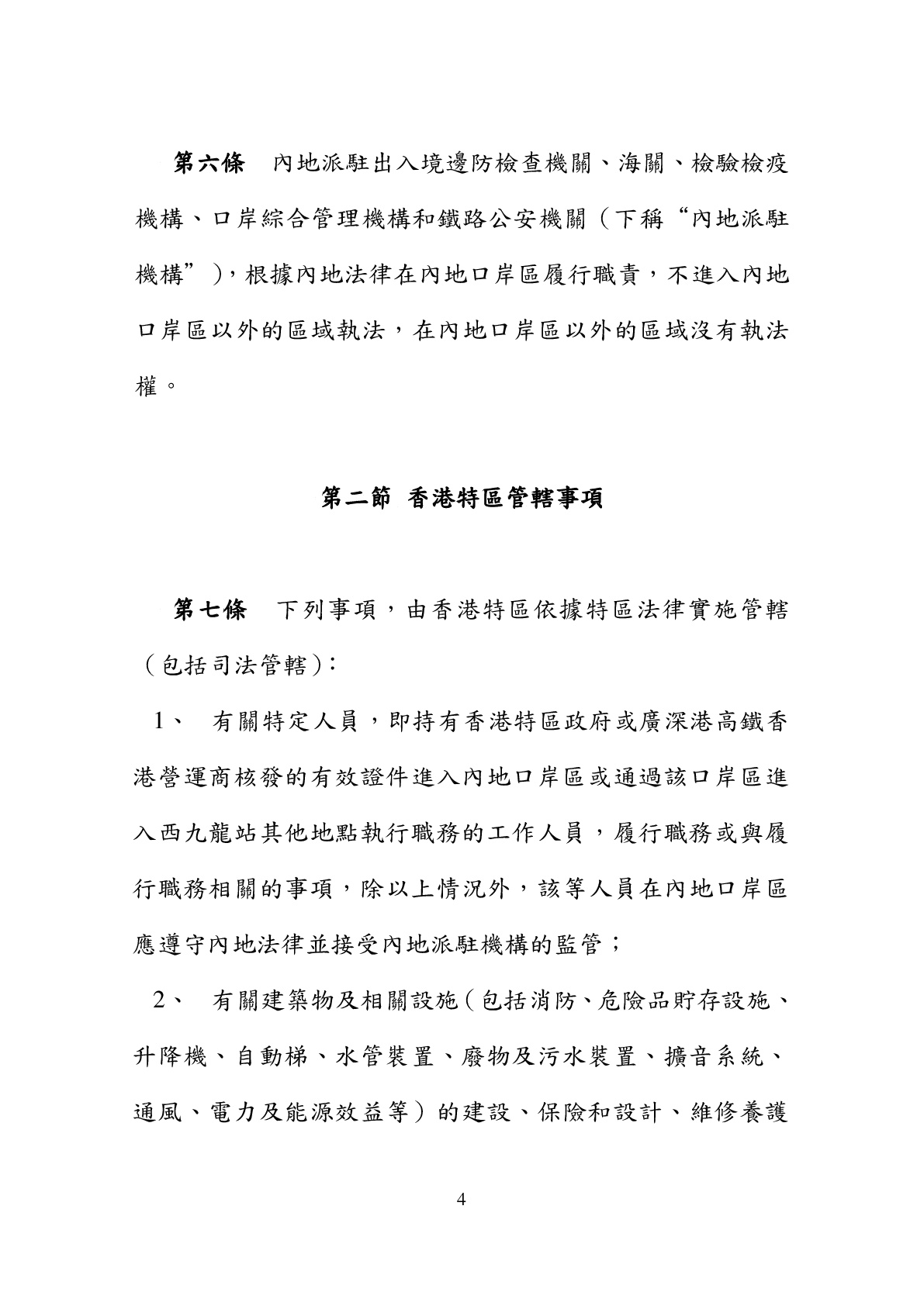 1、 有關特定人員,即持有香港特區政府或廣深港高鐵香港營運商核發的有效證件進入內地口岸區或通過該口岸區進入西九龍站其他地點執行職務的工作人員,履行職務或與履行職務相關的事項,除以上情況外,該等人員在內地口岸區應遵守內地法律並接受內地派駐機構的監管;