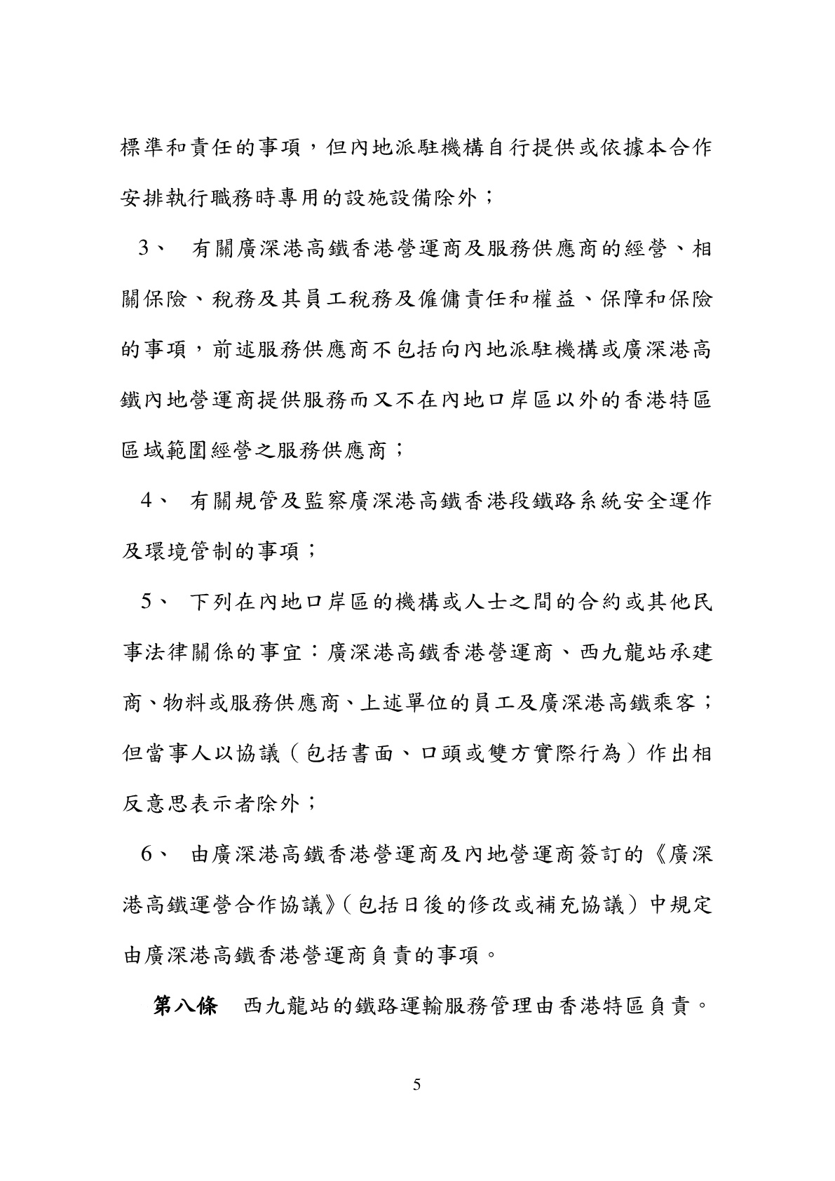 6、 由廣深港高鐵香港營運商及內地營運商簽訂的《廣深港高鐵運營合作協議》(包括日後的修改或補充協議)中規定由廣深港高鐵香港營運商負責的事項。
