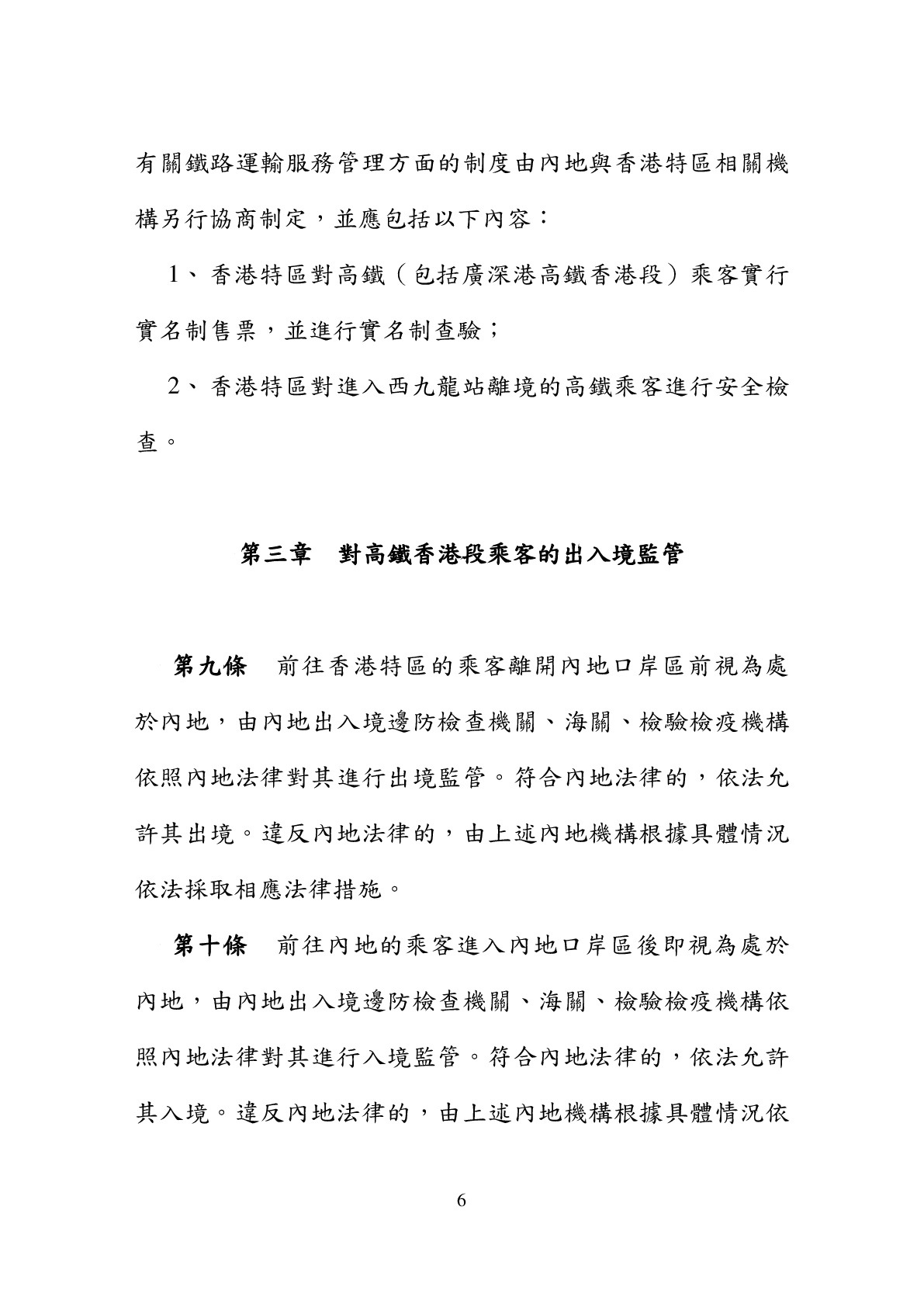 對高鐵香港段乘客的出入境監管前往香港特區的乘客離開內地口岸區前視為處於內地,由內地出入境邊防檢查機關、海關、檢驗檢疫機構依照內地法律對其進行出境監管。符合內地法律的,依法允許其出境。違反內地法律的,由上述內地機構根據具體情況依法採取相應法律措施。