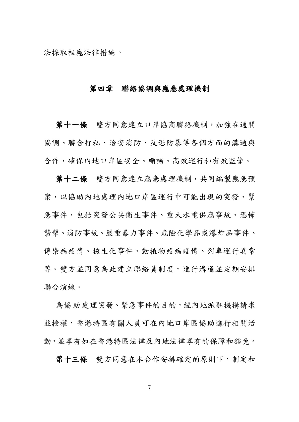 聯絡協調與應急處理機制雙方同意建立口岸協商聯絡機制,加強在通關協調、聯合打私、治安消防、反恐防暴等各個方面的溝通與合作,確保內地口岸區安全、順暢、高效運行和有效監管。