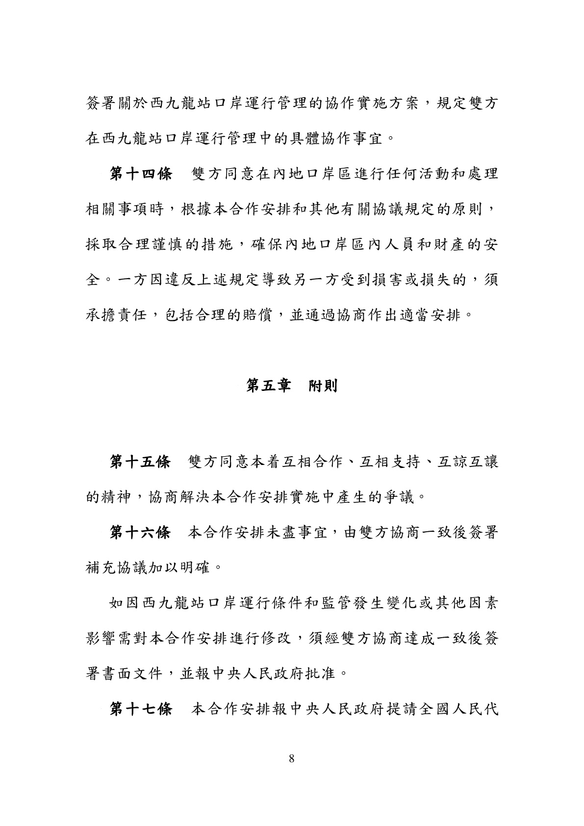雙方同意在本合作安排確定的原則下,制定和簽署關於西九龍站口岸運行管理的協作實施方案,規定雙方在西九龍站口岸運行管理中的具體協作事宜。