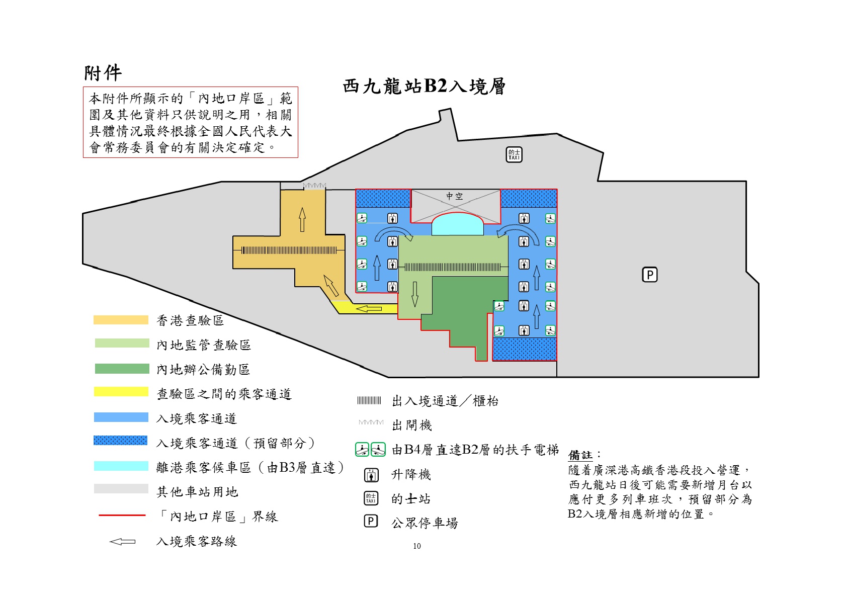 內地口岸區的範圍為西九龍站地下二、三層的劃定區域、地下四層月台區域及有關連接通道,包括內地監管查驗區、辦公備勤區、離港乘客候車區、車站月台和連接通道及電梯。內地口岸區範圍的詳情見附件。