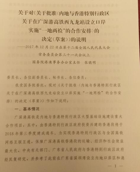 在有關說明文件中,港澳辦主任張曉明表示,在西九龍站實施「一地兩檢」,是「一國兩制」實踐中遇到的新情況,全國人大常委會明確表明合作安排,符合一國兩制方針、國家憲法和基本法,可以為一地兩檢提供法律基礎。
