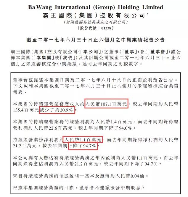 但据2017年霸王集团年中业绩报告公告显示,公司今年上半年的总营业收入为人民币1.071亿元,同比下降20.9%;净利润约为110万元,同比下降94.7%,经营状况仍不乐观。
