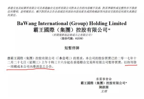 昨日午间,霸王集团(01338.HK)在港交所公告称,公司的股份买卖已于今日上午10时36分起暂停买卖,以待刊发一项构成公司内幕消息之公告。