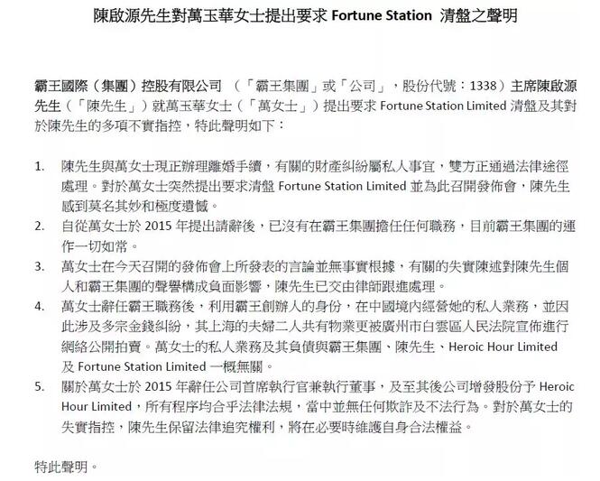 就在发稿前,霸王集团公关部门相关人员给每日经济新闻记者发来一份陈启源的个人声明,声明中称:集团主席陈启源与万玉华现正办理离婚手续。