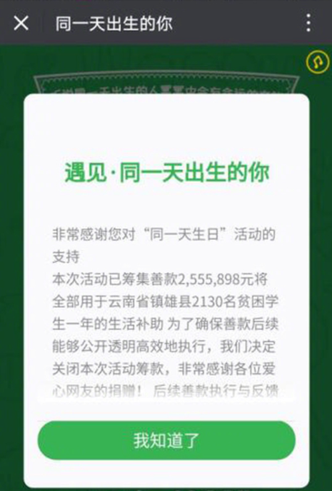 到24日11时左右,募捐活动页面显示,活动已筹集善款2555898元,将全部用于2130名贫困学生一年的生活补助。同时,页面显示:「为了确保善款后续能够公开透明高效地执行,我们决定关闭本次活动筹款。」