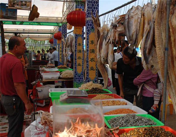 在主会场内,摆放东涌镇农业"一村一品"等各类名优农产品的宣传介绍,让游客了解之余还可以咨询销售员价格并带回家哦。主会场入口处,用渔船、渔网等水乡风情道具及东涌镇各类名优农产品摆出场景堆头,寓意一帆风顺、风调雨顺、五谷丰登。