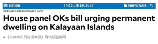 菲媒称,菲律宾众议院希望通过允许民众和投资者购置土地的方式,鼓励国民在“卡拉延群岛”“永久居住”。“卡拉延群岛”是菲律宾在南沙群岛控制的部分岛礁的称呼。