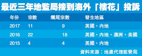 今年的投訴案中,6宗投訴仍在調查中。去年共有22宗相關投訴,18宗與「爛尾」相關,發生在英國、澳洲、美國和中國內地;至於2015年的4宗投訴全部都是關於「爛尾樓」,發生地在英國和中國內地。