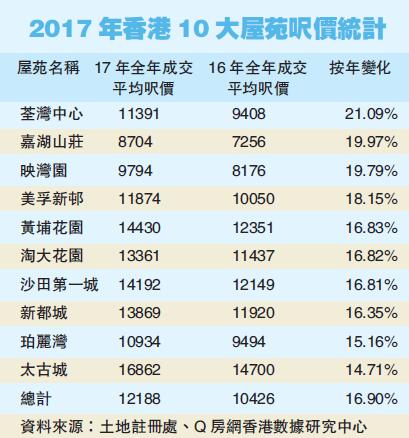 今年首三位成交最多的屋苑,依次為天水圍嘉湖山莊、沙田沙田第一城及荔枝角美孚新恏,排名與去年一樣,不過今年該三個屋苑成交量均逆市下跌,跌幅介乎6%至16%。今年十大屋苑尺價均價大升16.9%,由每宗尺價10426元升至12188元。其中以荃灣中心尺價升幅最高,達21.1%。嘉湖山莊尺價升20.0%,升幅排第二。交投大升的映灣園,尺價則升19.8%。