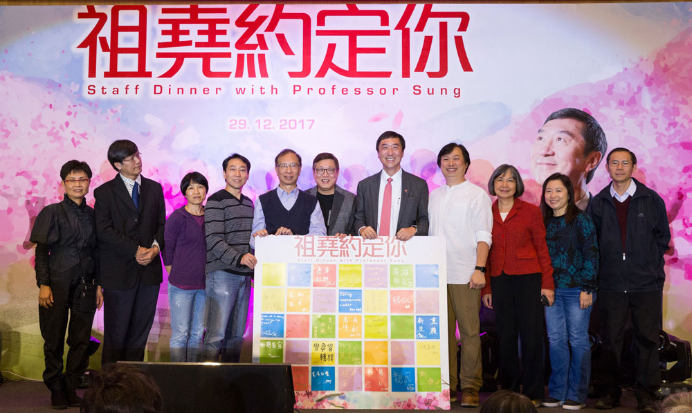 中大教職員致送大型感謝卡予沈祖堯(右五)。