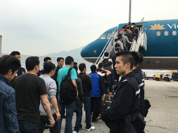 入境處日前以包機遣返68名越南非法入境者,圖為被遣返者依序登機。 入境處提供圖片