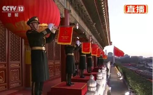 由军乐团八名礼号手在天安门城楼演奏《升旗号角》音乐,增加了升旗仪式的神圣感与仪式感。八名礼号手经过严格挑选,从技术到体貌都是最优秀的,未来一年基本不会轮换。