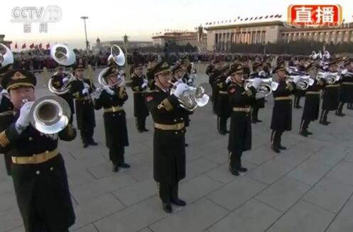 2018年元旦升国旗仪式最大亮点,就是有八名礼号手登上吹奏台吹响号角,嘹亮的号声划破夜空,迎来2018年的第一缕曙光。