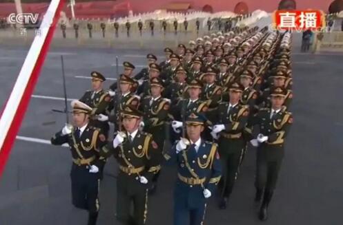 走在国旗手与护旗队中间的分队长,此次从一名增加到了三名,他们分别身着陆海空军礼服,配挂指挥刀,代表解放军全军,负责发出升国旗口令。