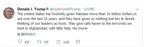 报道认为,令人略感惊讶的是,特朗普在周一清早发推矛头直指美国对巴基斯坦的援助项目和巴方与恐怖主义之间的联系。他在推文中称:“在过去的15年中,美国曾愚蠢的给予了巴基斯坦价值高达330亿美元的援助,但巴方却没有能给我们回馈,只有欺骗和谎言,把我们的领导人们当傻子(对待)。” 特朗普还指控巴基斯坦与恐怖份子武装有关,并称:“他们还为我们在阿富汗追缴的恐怖份子提供温床,进行少许帮助。这种现象应该终结了!”